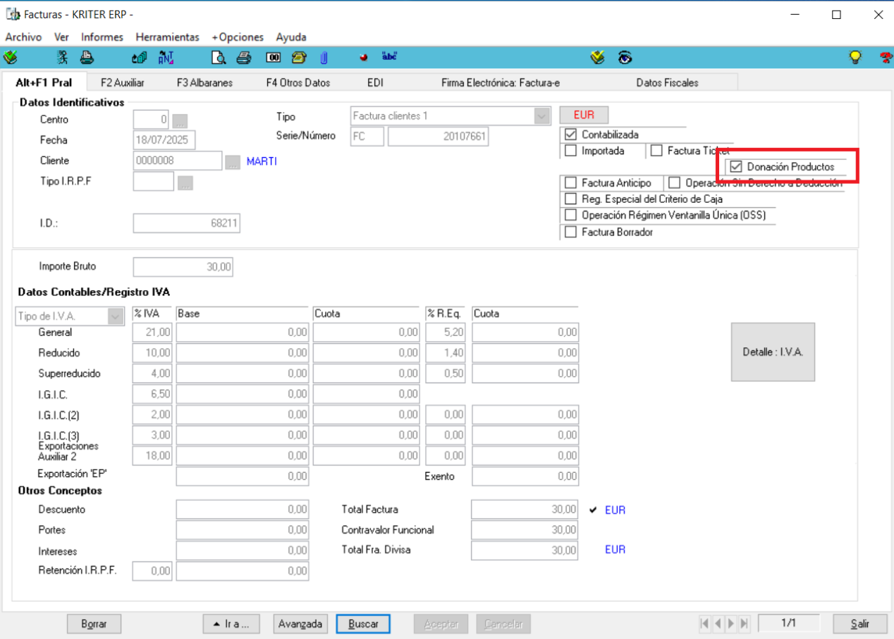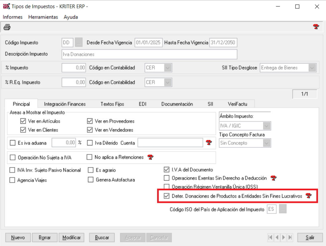 En el módulo de Auxiliares->Contables->Tipos de IVA, se deberá definir un tipo de iva específico para las donaciones, marcando el check de Determinadas Donaciones de Productos a Entidades Sin Fines Lucrativos. Nota: Se deberá parametrizar el resto de campo de dicho iva a efectos de Integración Finanzas, SII, Verifactu, etc.