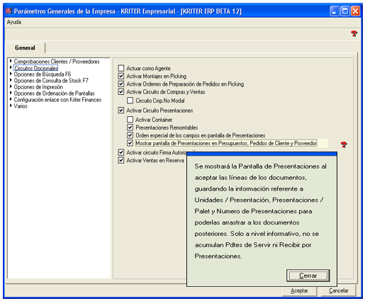 Existe la posibilidad de que aparezca la pantalla de Presentaciones al aceptar líneas de los documentos de Presupuestos, Pedidos de Clientes y Pedidos de Proveedores.