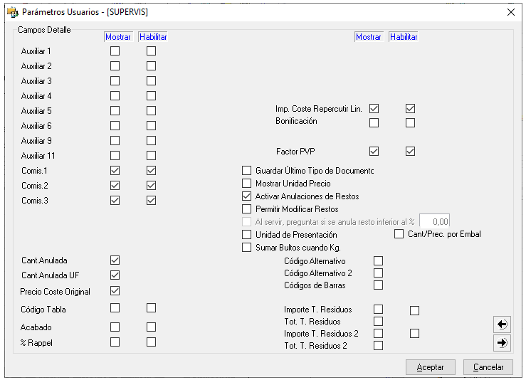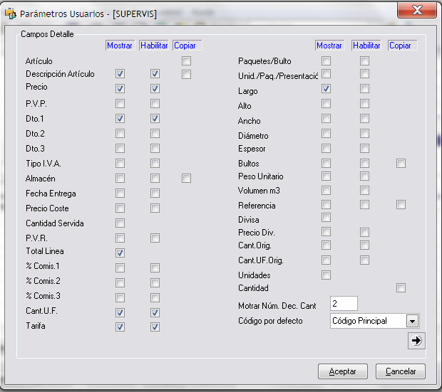 Accedemos a los parámetros del usuario para cambiar la definición de las columnas de las líneas, donde Mostrar nos mostrará la columna, Habilitar nos permitirá modificar el dato de dicha columna y copiar nos copiará de línea anterior.