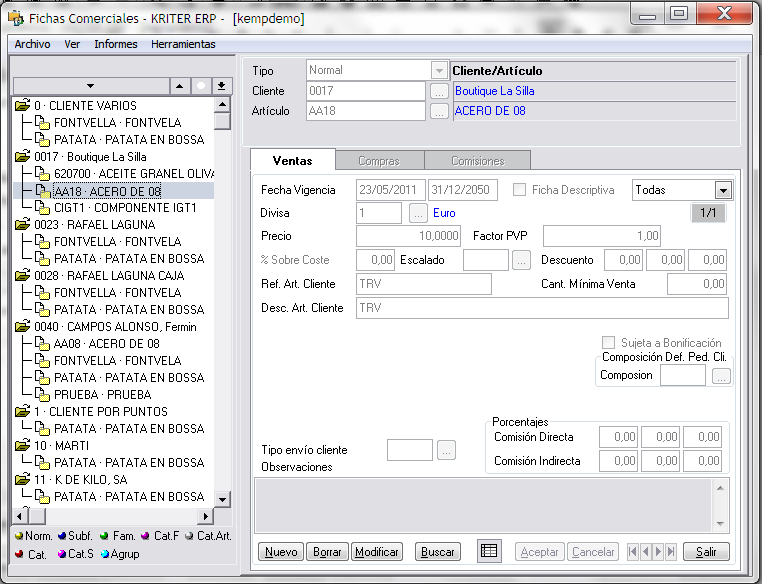 Acceso a las fichas comerciales de clientes para dar de alta, modificar, consultar, imprimir, listar o anular alguna de ellas (consultar Clientes/ Fichas Comerciales).