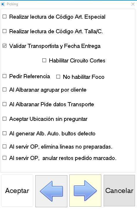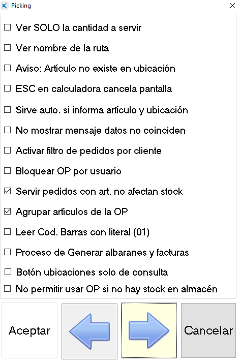 • Al serivr OP, anular restos pedido marcado: Con este check marcado al servir la OP a albarán, se anularán las cantidades pendientes (restos) del pedido marcado. Nota: En Picking PDA sin parámetro Size este parámetro se encuentra en la última pantalla de parámetros