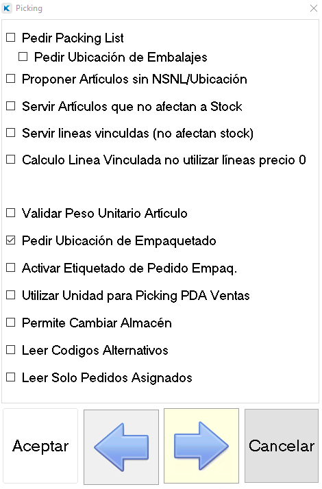• Pedir Ubicación de Empaquetado: Con este check se solicitará la ubicación del empaquetado.