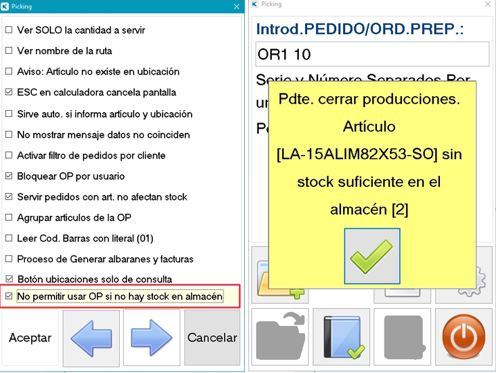 • Al serivr OP, anular restos pedido marcado: Con este check marcado al servir la OP a albarán, se anularán las cantidades pendientes (restos) del pedido marcado. Nota: Esta opción se encuentra en la pantalla 2ª de parámetros de Picking PDA Size