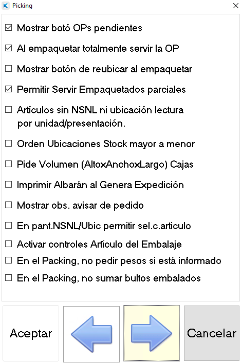 • Avisar en caso de empaquetar menos cantidad: Con este check marcado al empaquetar menos cantidad que la indicada en el pedido saldrá un mensaje de advertencia. Nota: Sólo disponible en Picking Pda con parámetro Size