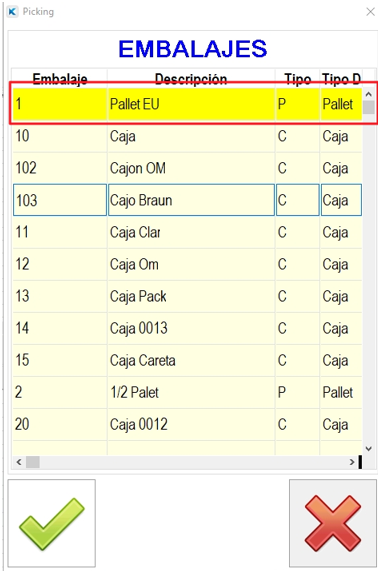Se mostrará la lista de embalajes, para escoger el deseado
