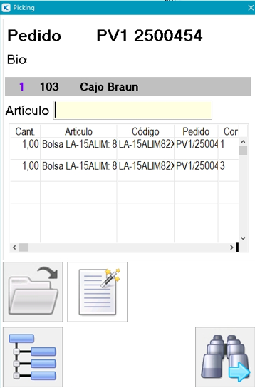 Al abrir pedido solicitará el artículo del mismo a servir, la pantalla cambiará en función de las características de los artículos del pedido.