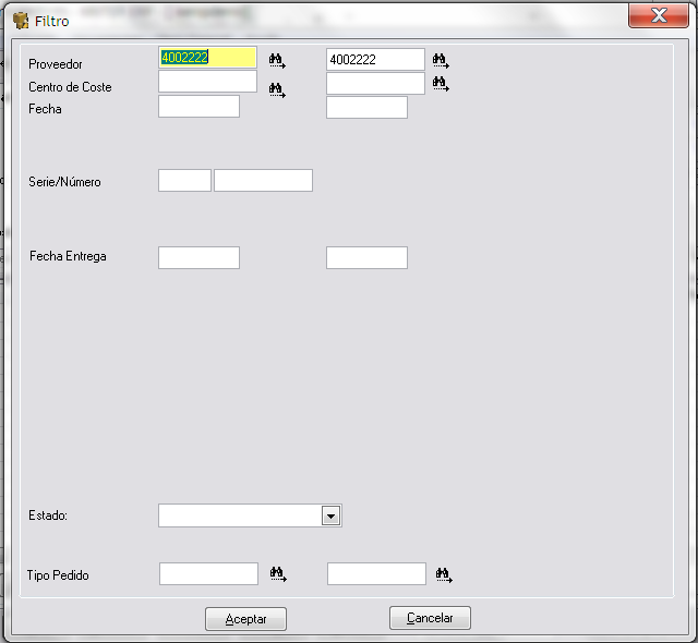 Nos mostrará un filtro para acotar los pedidos a consultar: