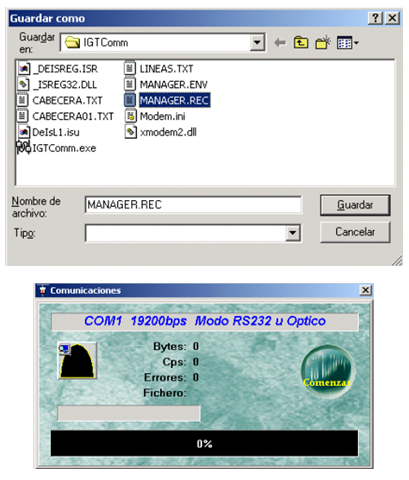 se nos mostrará en pantalla el programa de comunicaciones. Cuando se nos muestre pulsaremos sobre Manager y seleccionamos el fichero manager.rec de la pantalla que aparece a continuación. Una vez realizada esta operación nos aparecerá una nueva ventana donde aparecerá el estado de las comunicaciones. Con la ventana de comunicaciones tenemos el PC listo para comenzar la transmisión.