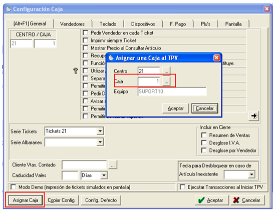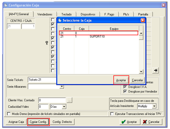 Nota: Inicialmente la configuración por defecto, se crea con la “Caja 0”, pero al crear la configuración asignaremos una “Caja 1” (aunque no la tengamos creada) y posteriormente copiaremos la configuración de la 0. Esta operación la realizamos para tener siempre una “cópia de seguridad de la caja inicial” por si se efectuan modificaciones en la configuración podamos consultar las iniciales.