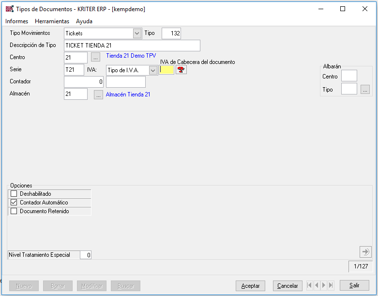 Para ello, accedemos al módulo Auxiliares->Parámetros->Tipos de documento.