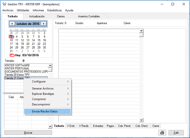 Desde el módulo de Gestión TPV, estando situados sobre el centro de la tienda, con el botón derecho del ratón, podemos realizar un envío/recepción de datos.