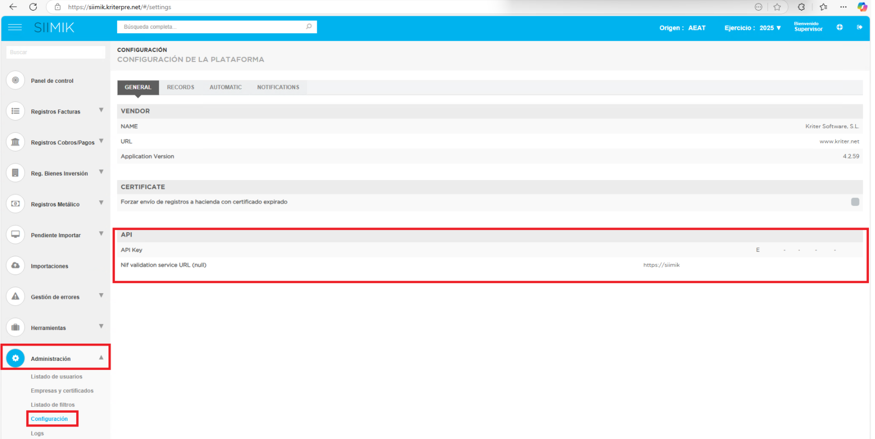 En primer lugar deberemos marcar el check para Activar los WebServices validación NiF-AEAT, y activar la validación NIF-SIIMIK. Deberemos indicar la URL de SIIMIK que encontraremos en el SIIMIK, area de Administración->Configuración, así como la APIKEY. Estos datos se deberán copiar tal como se muestran en la configuración del SIIMIK