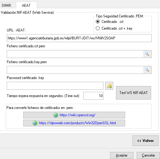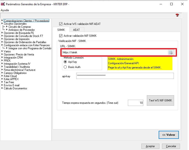 - Configurar Web Service AEAT - Validación NIF: Nos permitirá parametrizar el acceso a los servicios de la AEAT de validación del NiF vía SIIMIK. Si disponemos del programa Kriter SIIMIK se podrá activar en Auxiliares la validación de los NIF de clientes/proveedores, al dar de alta estos o al modificar los mismos.
