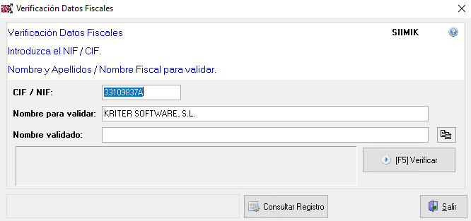 Pulsando el botón de TEST WS NIF-SIIMIK se podrá verificar su correcto funcionamiento, deberemos indicar unos datos válidas y pulsando F5 Verificar la AEAT nos responderá sobre dicho nombre validado.