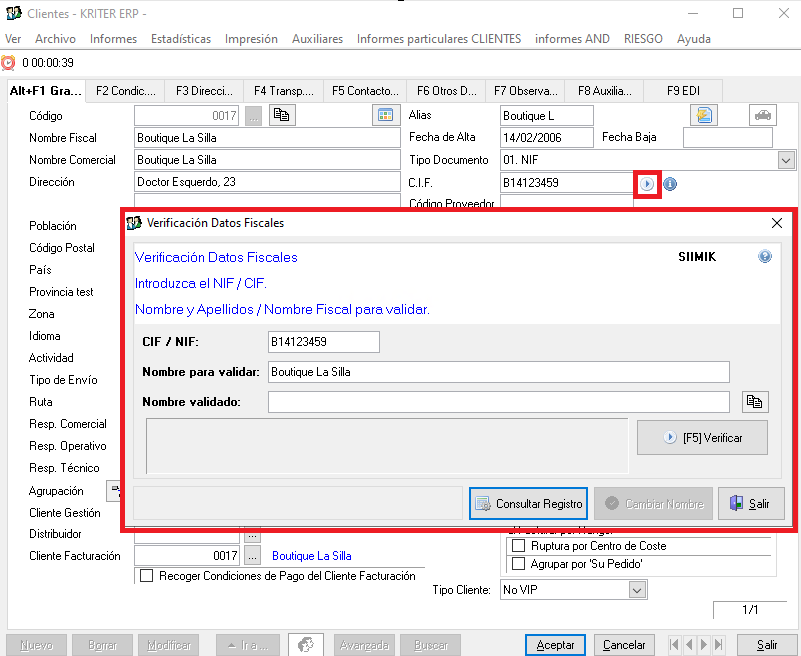 Cuando está activada la verificación, aparecerá junto al NIF el icono para acceder a la verificación de datos fiscales tanto del cliente como de proveedor. De esta forma se puede garantizar la calidad de datos desde el propio proceso de alta del cliente o proveedor.