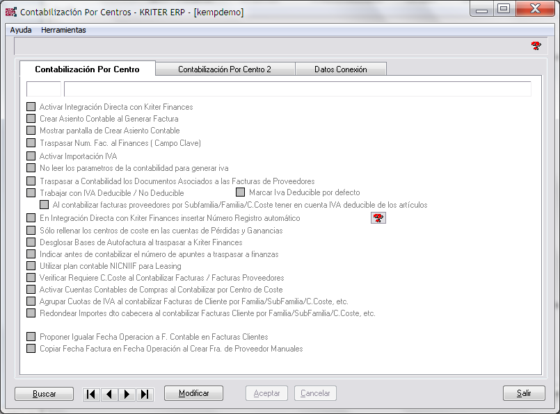 Disponemos de varias pantallas para definir como deseamos se comporte la contabilización de Kriter ERP hacia Kriter Finances. Todos los actuales desarrollos de Kriter que afectan a la contabilización y generación de asientos requieren que se use la Integración Directa con Kriter Finances, que estén activados la Creación de Ivas por parte de la empresa (Auxiliares, Parámetros Generales, Pestaña Funcionalidades Adicionales), y en Kriter Finances tener activo el Registro extendido de iva. Si no dispone de dicha configuración consulte con su distribuidor para su estudio.