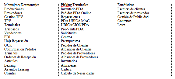 Nota: Esta funcionalidad se ha añadido inicialmente en las pantallas principales de los siguientes módulos/opciones. Los filtros de los informes se tratarán en SPs posteriores o nuevas versiones:
