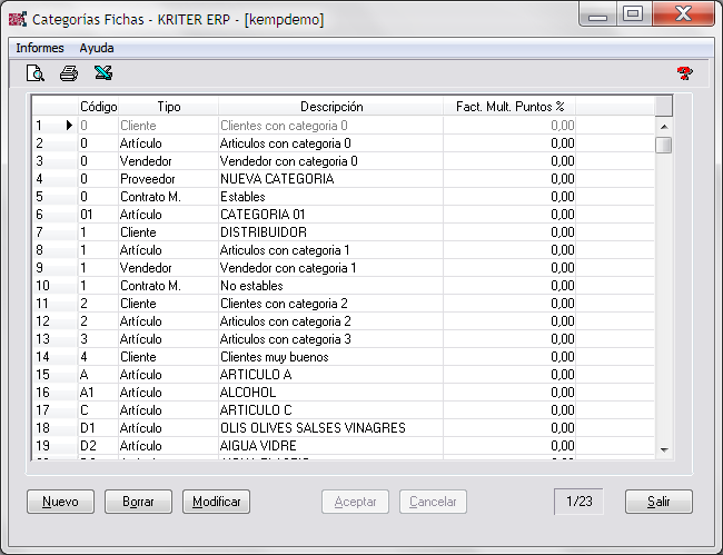 En este apartado abriremos las categorías de fichas de Cliente, Artículo y Vendedor si se van a utilizar en el sistema de precios fichas comerciales por categoría. Esto quiere decir asignar precios y/ o descuentos de artículos para una categoría de Clientes, Artículos y/ o Vendedores (véase Vendedores – Fichas Comerciales).