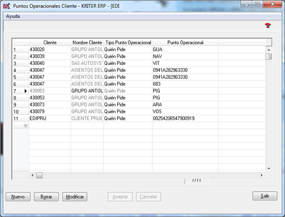 Desde esta opción de Auxiliares, definiremos los puntos operacionales adicionales de los clientes. Es necesario su definición cuando para un mismo cliente puede existir más de un punto que realiza pedidos, y por tanto existe más de un punto operacional tipo Quién Pide