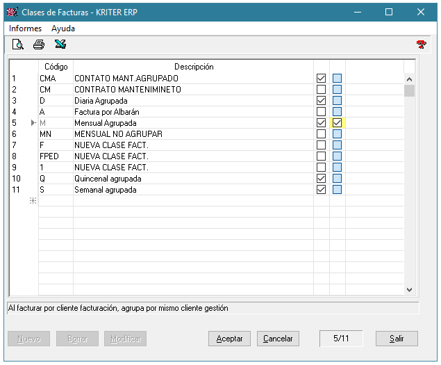 El objetivo es definir tipos de facturación para poder facturar un tipo determinado (por albarán, mensual, semanal, etc.).