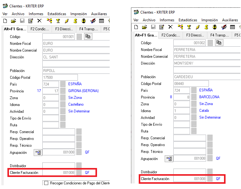 Ejemplo: Tanto el cliente 001001 como el cliente 001002 tienen como cliente de facturación el 001008