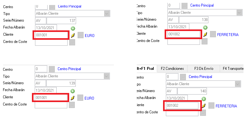 En el caso de tener activado cliente de Facturación se agrupa por el mismo cliente, y mostrará el mensaje informativo a pie de ventana.