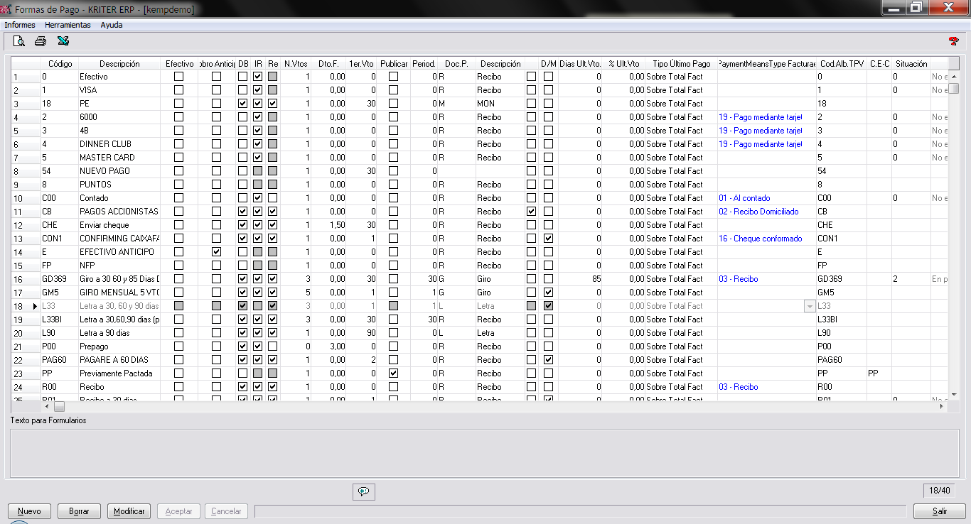 Adicionalmente a estos parámetros en la forma de pago podemos indicar el texto que deseamos sea mostrado en los formularios de impresión estándar (en caso de formularios personalizados consulte con su distribuidor). Y podremos obtener un informe general de las formas de pago, bien por vista previa, impresora o exportación EXCEL.