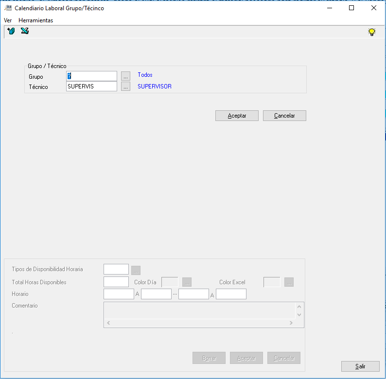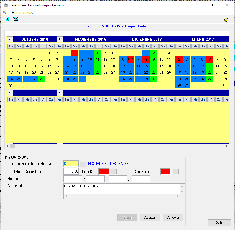 - Calendario Laboral: Realizaremos el mantenimiento del Calendario Laboral de los usuarios. Disponemos de posibilidad de multiselección entre otras funcionalidades en el menú de Herramientas.