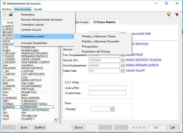 - Parámetros de Usuario: Nos permite gestionar los parámetros de usuario en Pedidos y Albaranes de Clientes y Proveedores, Presupuestos, y Parámetros de Picking