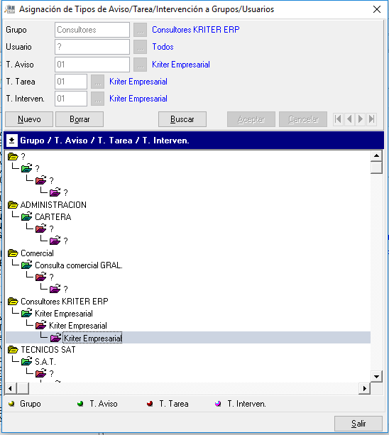 Con el botón de asignación de tipos de Avisos/Tareas/Intervenciones a Grupos/Usuarios, podemos indicar que relaciones permitimos entre los usuarios y los tipos de avisos, tareas e intervenciones. Podemos definir por ejemplo que para el Grupo de trabajo de Consultores, los de avisos y tareas sean de un tipo concreto, y no será posible asignar un tipo diferente, por ejemplo una tarea administrativa.