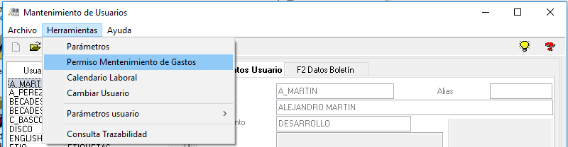 Únicamente los usuarios con permisos de Supervisor, detentando permisos de entrada, modificación y/o baja del mantenimiento de Gastos, podrán acceder a esta utilidad. Los permisos se tramitarán desde la utilidad de Archivo/ Usuarios. En la pantalla de Usuarios seleccionaremos la opción de menú Herramientas/ Permiso Mantenimiento de Gastos.