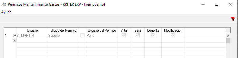 En la tabla de Mantenimiento que se nos abre con esta opción especificaremos los permisos de los que dispondrá cada usuario.