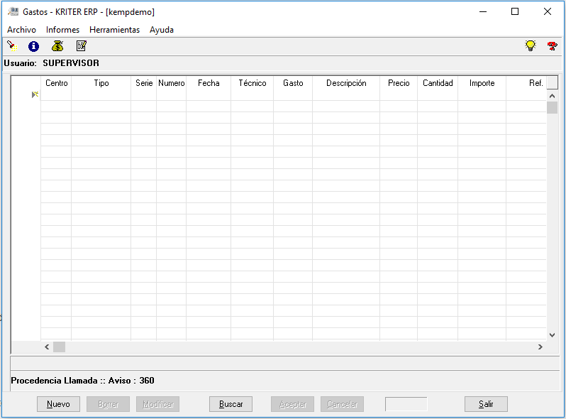 En la primera pantalla de trabajo para el Mantenimientos de Gastos se nos indicará en la parte inferior de la pantalla, la Procedencia (si venimos de una Aviso en concreto o de un Boletín).
