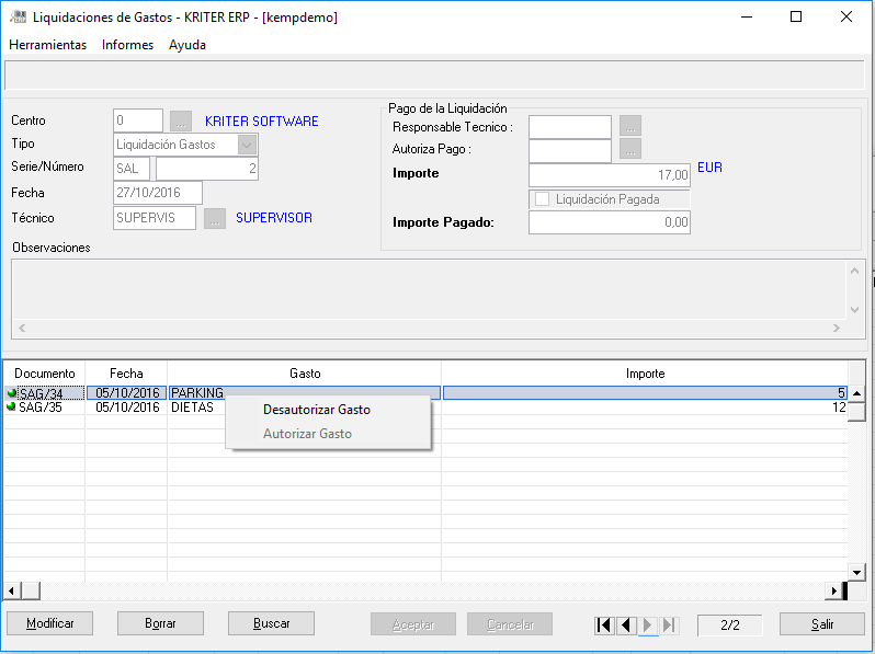 Desde la opción de Liquidaciones de Gastos posicionándonos sobre una línea al pulsar el botón derecho nos permitirá autorizar o desautorizar el gasto.