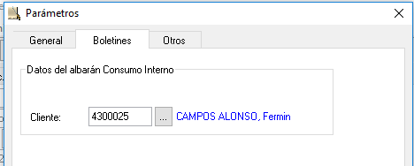 - Boletines: En la pestaña de boletines indicaremos el código del cliente, al que se realizará el albarán de consumo interno, cuando el tipo de Contrato es TODO INCLUIDO