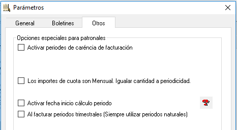 - Otros: En la pestaña de Otros encontramos los siguientes parámetros especiales de Patronales y Confederaciones de Empresarios asociados a la generación de albaranes y facturación de cuotas de asociados. Consulte con su Distribuidor.