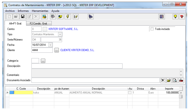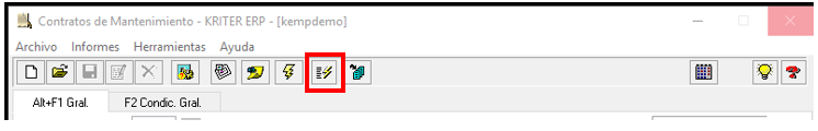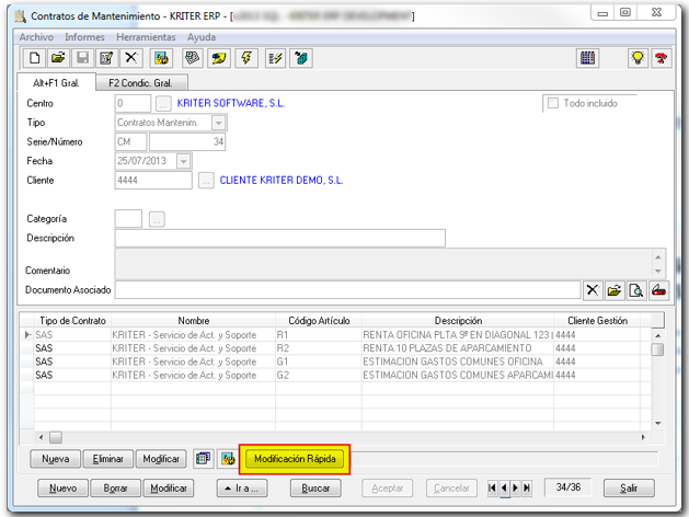 - Modificación rápida: Marcando este check se habilita la posibilidad de modificar directamente los datos de una línea del Contrato de Mantenimiento desde la misma lista.