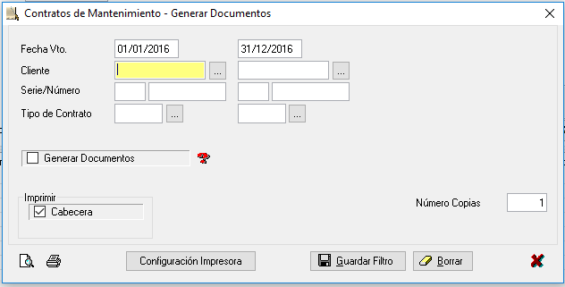 - Mostrar Informe Previo Generación de Avisos: Marcando esta opción se mostrará un informe para generar avisos de los contratos de mantenimiento según la configuración de clientes.