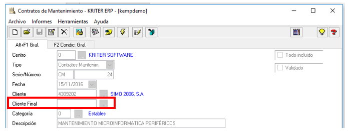 - Mostrar campo informativo cliente final: Con el check marcado se mostrará en el contrato el campo de Cliente Final