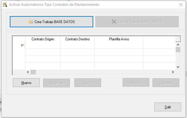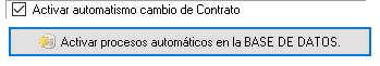 - Activar automatismo cambio de contrato: Permite crear un automatismo de cambio automático en los tipos de contrato en función de un periodo de días indicado en el tipo de contrato. La base de datos debe ser SQLSERVER y es necesario crear los procesos automáticos, indicando el tipo de contrato origen, el destino, la plantilla de avisos. Una vez definida la tabla de conversión generaremos mediante el botón Crea Trabajo BASE de DATOS los procesos en la misma para ejecutar dichas conversiones automáticas.También es posible la eliminación de la tarea programada en la misma