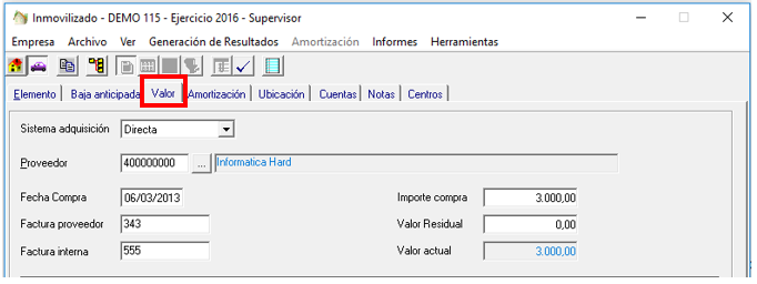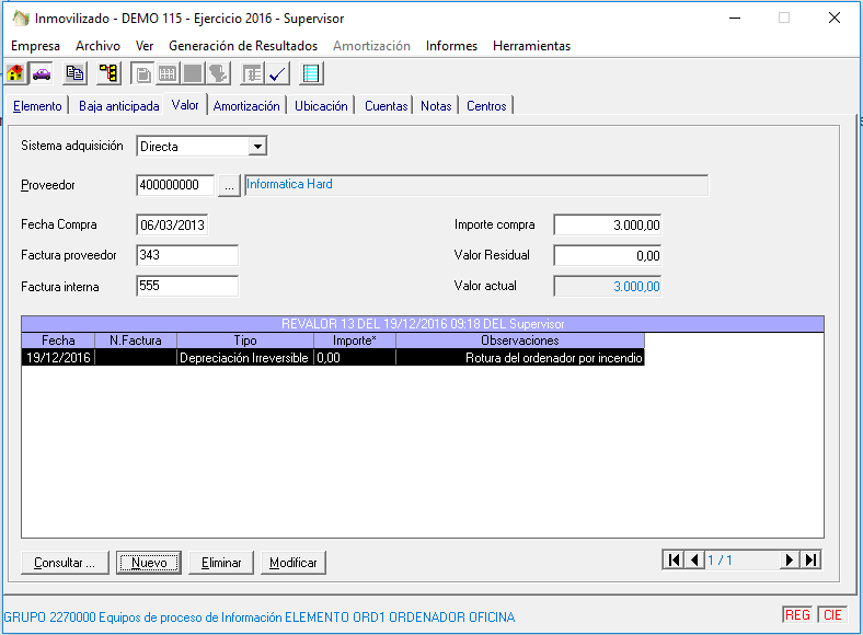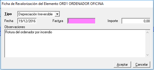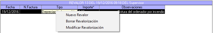 Como es normal, todo inmovilizado puede sufrir una revalorización o una depreciación. Es en esta pantalla donde anotaremos estas incidencias.