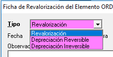 Pulsando Nuevo nos aparecerá esta ficha de revalorización o depreciación que cumplimentaremos según corresponda. Disponemos de tres tipos de Revalor, Revalorización, Depreciación Reversible y Depreciación Irreversible.