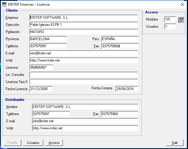 Junto al CD-ROM de instalación se entrega al usuario un disco licencia con sus datos y su número de serie registrado. Es necesario para trabajar con KRITER Finances instalar ese disco y montarlo en el sistema.