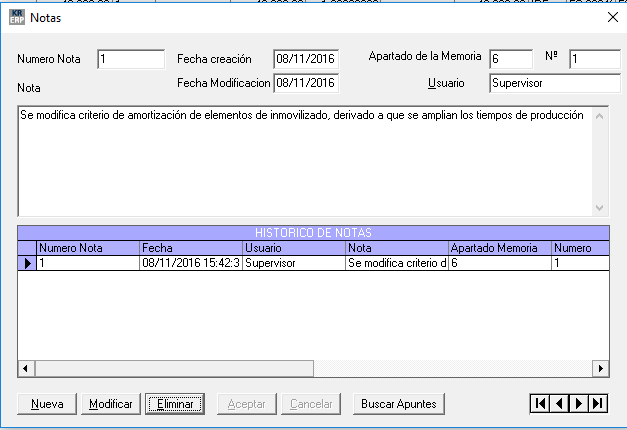 Desde el mantenimiento de Notas es posible recoger el conjunto de notas que se pueden asociar a apuntes, así como si deben recogerse en la Memoria de la Empresa. En este caso indicaremos el apartado y número de la misma a la que se vincula.