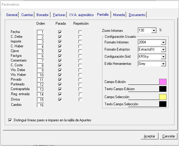Con la opción Repetición le indicamos si queremos que el campo marcado salga por defecto al hacer el siguiente apunte. Cada vez que hagamos un apunte estos valores se modifican.