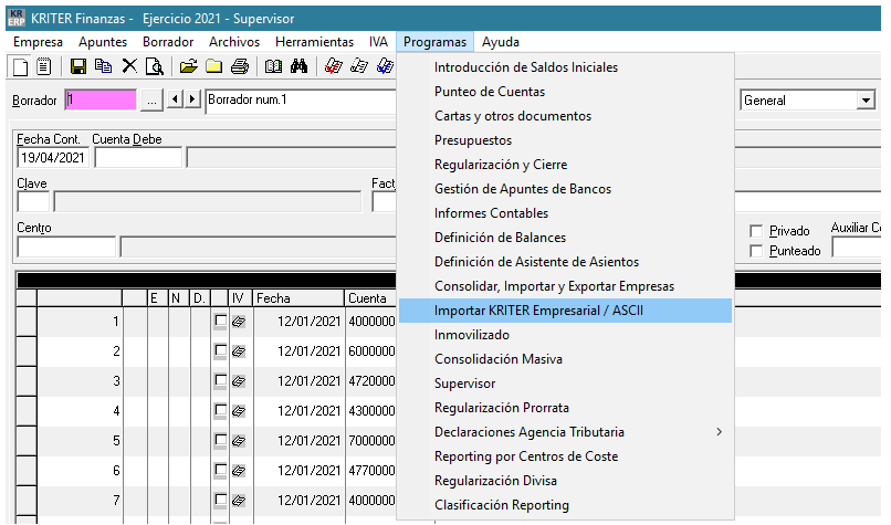 Este fichero se crea desde el Programa KRITER FINANZAS. Seleccionamos la pestaña de Programas -> Importar Kriter Empresarial/ASCII