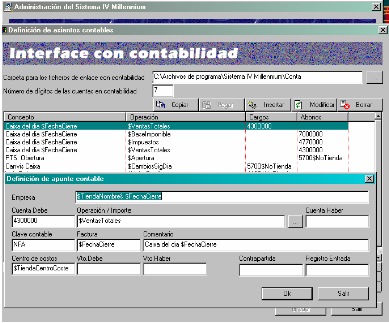 Entramos en el Programa administración del Sistema IV Millennium y accedemos al modulo Interface de Contabilidad. Mediante esta pantalla configuraremos el Interface de la forma siguiente: